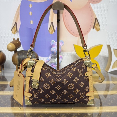 고객님께서 지금보시고 계시는 상품은 Louis Vuitton의 트렁크 메이킹 유산을 현대적으로 풀어낸 Side Trunk MM 라인으로, 클래식 모노그램 코티드 캔버스에 내추럴 탠 컬러의 가죽 트리밍을 더해 구조적인 실루엣과 상징적인 분위기를 동시에 완성한 디자인입니다. 견고한 형태감이 살아 있어 착용 시 가방이 흐트러지지 않고 단정하게 잡히며, 넉넉한 탑핸들로 손에 들었을 때 안정감이 좋습니다. 탈부착 가능한 가죽 스트랩을 연결하면 숄더/크로스 착용이 가능해 데일리부터 포멀 룩까지 폭넓게 활용하시기 좋습니다. 트렁크에서 영감을 받은 코너 메탈 디테일과 S-락 무드의 하드웨어 포인트가 시선을 집중시키며, 지퍼 여밈 구조로 수납 안정감도 확보했습니다. 내부는 스트라이프 계열 패브릭 라이닝으로 마감되어 사용 시 마찰 부담을 줄여드립니다.
