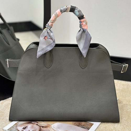 THE ROW Margaux 토트백은 브랜드를 대표하는 아이코닉한 라인으로, 절제된 디자인과 고급 가죽의 질감을 중심으로 완성된 타임리스 아이템입니다. 외부에는 마소니(MASONI) 계열의 고급 송아지가죽을 사용하여 부드럽고 섬세한 촉감을 제공하며, 가벼운 수분 접촉 시 자연스럽게 회복되는 특성을 지니고 있습니다. 사용 시간이 누적될수록 표면에는 은은한 오일 왁스감이 형성되어 깊이 있는 에이징이 진행되는 것이 특징입니다.