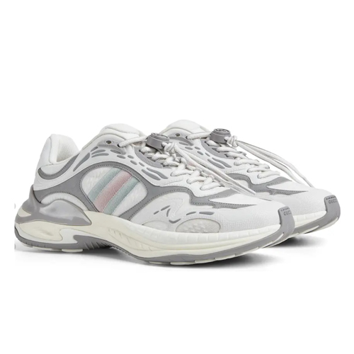 구찌 라이톤 메쉬 & 레더 스니커즈는 브랜드 특유의 볼륨감 있는 어글리 슈즈 실루엣을 기반으로, 스포티한 메쉬 소재와 부드러운 레더를 조합한 모델이다. 버건디 그레이 계열의 컬러 배색에 아이코닉한 스트라이프 디테일이 더해져 캐주얼하면서도 럭셔리한 분위기를 동시에 연출한다. 두툼한 EVA 러버 솔 구조로 착화 시 안정감과 쿠셔닝이 뛰어나며, 장시간 보행에도 피로감을 줄여준다. 데일리 캐주얼부터 스트릿 룩까지 폭넓게 활용 가능한 구찌 대표 스니커즈 라인이다.