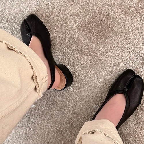 지금 손님께서 보고계시는 상품은 Maison Margiela의 MM6 라인에서 전개되는 타비 플리츠(주름) 디테일 발레리나 슈즈입니다. 시그니처인 스플릿 토(발가락 분리) 실루엣을 바탕으로, 측면에 압주름(플리츠) 포인트를 더해 한층 입체적인 형태감을 살렸습니다. 갑피는 ‘포도씨 결’ 텍스처가 느껴지는 나파 양가죽으로 안내되어, 은은한 결감과 부드러운 착화감을 기대하실 수 있습니다. 신발 입구는 V 라인 형태로 설계되어 발등을 더 자연스럽게 감싸주며, 전체적으로 과한 장식 없이도 정교하고 단정한 인상을 줍니다. 또한 이탈리아산 가죽 대창(레더 아웃솔) 사양으로 표기되어 고급스러운 마감과 착용감을 중시하시는 분께 적합합니다. 데일리 코디부터 미니멀한 룩, 포인트 코디까지 폭넓게 매치 가능하며, 브랜드 특유의 아이코닉한 형태를 깔끔하게 즐기실 수 있는 아이템입니다. (사이즈는 35–41로 안내되며, 40·41은 제작 사이즈로 교환/반품이 어렵다고 표기되어 구매 전 확인을 권해드립니다.)
