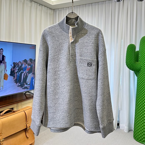 해당 제품은 LOEWE 특유의 미니멀한 감성과 빈티지 무드를 동시에 담아낸 하프오픈 스탠드카라 니트 스웨트셔츠입니다. 겉감은 부드럽고 밀도 높은 니트 소재를 사용하여 착용 시 자연스럽게 떨어지는 실루엣을 연출하며, 착용감이 매우 편안한 것이 특징입니다. 일반적인 스웨트셔츠와 달리 반오픈 형태의 스탠드카라 디자인을 적용해 단독 착용은 물론 이너 레이어드용으로도 활용도가 높습니다. 가슴 포켓에는 로에베를 상징하는 자수 디테일이 더해져 과하지 않으면서도 브랜드 아이덴티티를 확실하게 보여줍니다. 전체적으로 여유 있는 핏으로 제작되어 체형 커버에 용이하며, 남녀 공용으로 착용 가능합니다. 데님, 슬랙스, 와이드 팬츠 등 다양한 하의와 매치가 쉬워 데일리룩부터 세미 캐주얼 스타일까지 폭넓게 활용할 수 있는 아이템입니다.