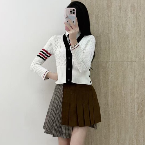 고객님께서 지금보시고 계시는 상품은 Thom Browne F/W 컬렉션의 4-Bar 크롭 케이블 니트 가디건입니다. 브랜드를 대표하는 사선 4선 스트라이프 디테일과 클래식 케이블 니트 조직이 조화를 이루는 아이코닉 여성 니트웨어로 세련된 프레피 무드를 완성해주는 제품입니다. 입체적인 케이블 편직 구조의 울 니트 소재를 적용하여 뛰어난 보온성과 탄탄한 형태 안정성을 제공하며 부드러운 착용감으로 데일리 착용에 적합합니다. 크롭 기장과 슬림한 실루엣이 자연스럽게 바디 비율을 살려주며 하이웨이스트 팬츠 및 스커트와 매치 시 더욱 균형 잡힌 스타일을 연출합니다. 브이넥 버튼 구조와 후면 시그니처 삼색 탭 디테일이 더해져 톰브라운 특유의 클래식 감성을 완성하는 프리미엄 니트 가디건입니다.