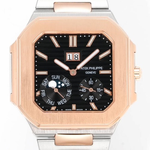 파텍필립 큐비터스 5822 스테인리스 스틸 모델은 스퀘어에 가까운 케이스 형태와 깊이감 있는 블루 다이얼이 조화를 이루는 하이엔드 스포츠 럭셔리 워치입니다. 기존 골드 모델과 달리 스틸 케이스와 스틸 브레이슬릿을 적용해 보다 현대적이고 실용적인 분위기를 강조했으며, 캐주얼과 포멀 스타일 모두에 자연스럽게 어울립니다. 다이얼에는 날짜, 요일, 문페이즈 기능이 모두 실기능으로 적용되어 시각적 완성도뿐 아니라 실사용 만족도를 높였습니다. 무브먼트는 개조 240PS 계열의 편심 마이크로 로터 자동 무브먼트로 설명되며, 안정적인 구동과 얇은 케이스 설계를 지향합니다. 사파이어 크리스탈 글래스를 적용해 스크래치에 강하고, 6시 방향 케이스에는 0.02캐럿 사각 다이아몬드가 세팅되어 절제된 고급 포인트를 더합니다. 케이스 사이즈는 45mm로 표기되지만 이는 10시~4시 대각 기준이며, 상하 폭은 이보다 짧아 실제 착용 시 과도하게 커 보이지 않는 점이 특징입니다. 파텍필립 특유의 정제된 마감과 독창적인 디자인을 동시에 경험할 수 있는 모델입니다.