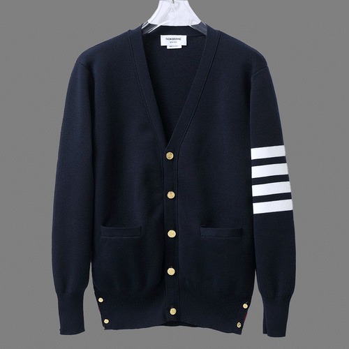 톰브라운의 캐시미어 가디건입니다. 네이비 색상에 소매 부분의 시그니처 스트라이프 디자인이 특징입니다. 금색 TB 로고 버튼이 고급스러움을 더하며, 남녀 공용으로 착용 가능합니다.