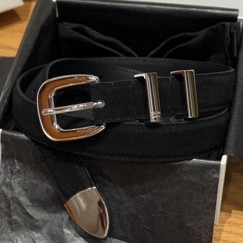 셀린느 웨스턴 25mm 소가죽 벨트는 중간 폭의 실용적인 사이즈로 제작되어 데일리 룩과 포멀 룩 모두에 잘 어울립니다. 겉면은 부드러운 스웨이드 가공의 소가죽을 사용해 은은한 질감과 고급스러운 브라운 컬러를 구현했으며, 안쪽은 매끈한 소가죽 안감으로 마감해 착용 시 안정감과 내구성을 높였습니다. 중간 위치에 골드 톤의 메탈 버클과 금속 장식을 배치해 서부풍 감성을 살렸고, 두 개의 금속 벨트 고리와 끝부분의 금속 팁 장식이 포인트가 됩니다. 첫 번째 원형 링 하단에는 브랜드 로고가 각인되어 디테일을 더하며, 셀린느 박스와 더스트백이 함께 구성되어 선물용으로도 적합한 아이템입니다.