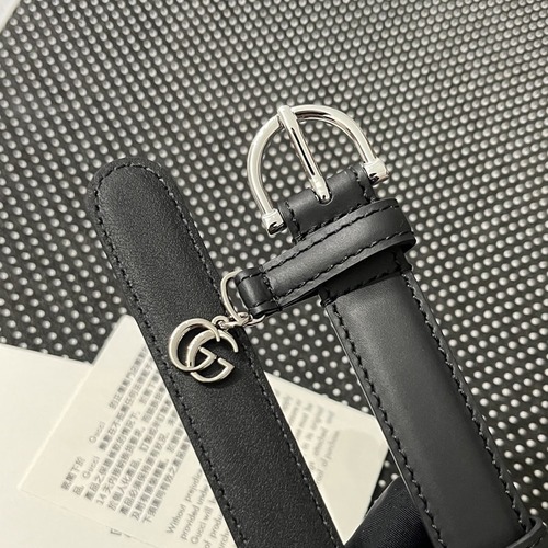 구찌 여성 3.5cm 가죽 벨트로, 블랙 컬러 스트랩에 반원 형태의 골드 톤 버클이 더해져 세련된 인상을 주는 제품입니다. 버클 아래에는 작은 GG 로고 참 장식이 달려 있어 움직일 때마다 은은하게 포인트가 되며, 단정한 스티치 마감으로 고급스러운 완성도를 보여줍니다. 3.5cm의 적당한 폭으로 하이웨스트 팬츠나 스커트, 셔츠 원피스 등 다양한 스타일에 매치하기 좋고, 여러 개의 홀로 허리 사이즈 조절이 편리합니다. 단단한 핀 버클 구조로 착용과 탈착이 간편하며, 블랙 컬러 특유의 높은 활용도로 사계절 내내 데일리 아이템으로 사용하기 적합한 허리벨트입니다.