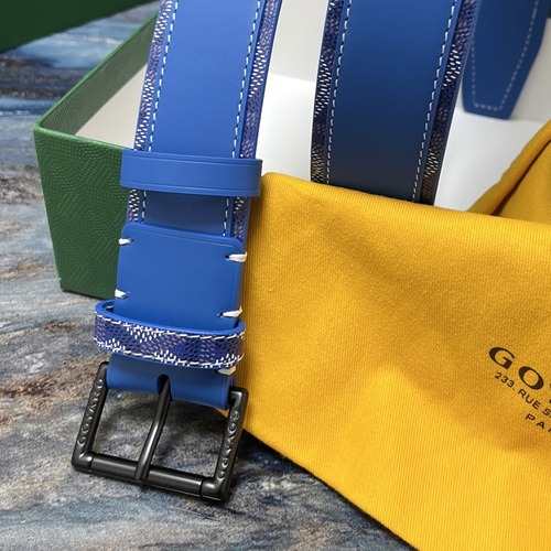 고야드 스타일의 블루 컬러 허리 벨트로, 폭 4.0cm의 적당한 두께와 견고한 구조가 특징입니다. 수입 1층 소가죽과 도그투스 패턴 코팅 캔버스를 조합해 제작되어 부드러운 착용감과 뛰어난 내구성을 동시에 제공합니다. 섬세한 수작업 공정으로 마감되어 스티치가 고르고 깔끔하며, 가장자리는 매끈하게 처리되어 장시간 착용해도 편안합니다. 사각 버클에는 브랜드 로고가 새겨져 고급스러운 포인트를 더해 주며, 여러 개의 조절 홀로 허리 둘레에 맞게 세밀한 조절이 가능합니다. 클래식한 디자인과 강한 매치력으로 정장, 비즈니스 캐주얼, 데일리 룩 등 다양한 스타일에 잘 어울려 여러 가지 상황에서 활용하기 좋은 아이템입니다.