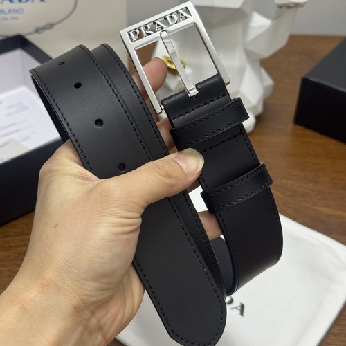 프라다의 사피아노 가죽 남성 벨트로, 폭 3.5cm의 실용적인 사이즈와 블랙 컬러가 특징입니다. 견고한 사피아노 텍스처 가죽이 사용되어 스크래치에 강하고 형태가 잘 유지되며, 매트한 광택이 고급스러운 인상을 줍니다. 실버 톤 사각 프레임 버클 상단에는 PRADA 로고가 정교하게 새겨져 있어 심플하면서도 존재감 있는 포인트가 됩니다. 여러 개의 조절 홀로 허리 사이즈에 맞게 세밀한 조절이 가능하며, 정장 팬츠는 물론 캐주얼 데님이나 치노와도 잘 어울려 데일리 벨트로 활용도가 높습니다. 전체적으로 군더더기 없는 디자인과 깔끔한 마감, 세심한 스티치 처리로 브랜드 특유의 세련된 분위기를 느낄 수 있는 아이템입니다.