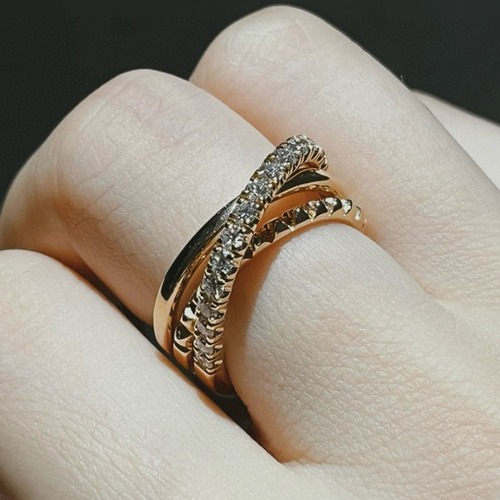 까르띠에 LOVE 컬렉션을 현대적으로 재해석한 트리플 링 다이아몬드 버전입니다. 세 개의 링이 교차하며 하나의 디자인을 이루는 구조로, 각각의 밴드에는 정교한 다이아몬드 세팅과 스크류 모티프가 조화를 이룹니다. 입체적인 레이어드 형태로 손가락 위에서 풍부한 볼륨감과 화려한 광채를 연출하며, 착용 시 고급 주얼리 특유의 존재감을 확실히 느낄 수 있습니다. 최근 특히 인기가 높은 디자인으로, 데일리보다는 포인트 아이템이나 기념일 주얼리로 적합한 모델입니다.