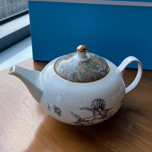 이 티포트는 1970년대 복고 디자인을 현대적으로 재해석한 제품으로, 벌새의 유려한 실루엣에서 영감을 받은 둥근 형태와 섬세한 꽃·새 패턴이 특징입니다. 상단 뚜껑에는 녹색과 분홍색이 어우러진 마블 무늬와 골드 포인트가 더해져 고급스러운 분위기를 자아내며, 주둥이와 손잡이, 입구 가장자리에도 금색 라인이 둘러져 있어 테이블 위에서 한층 돋보입니다. 고급 본차이나 소재를 사용해 표면은 미세한 광택과 부드러운 촉감을 지니며, 색감이 따뜻하고 은은해 일상 다과상은 물론 손님 접대용으로도 적합합니다. 실사용은 물론 인테리어 소품이나 선물용으로도 손색이 없는 품목으로, 전용 박스와 함께 제공되어 보관과 포장이 편리합니다.