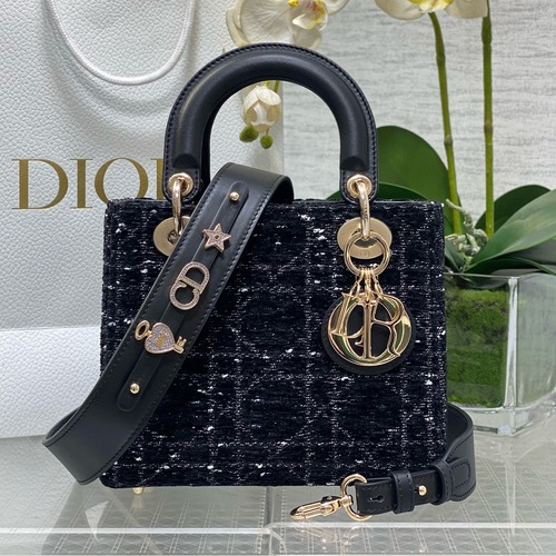 디올의 아이코닉 라인인 Lady Dior My ABCDior 스몰 토트백으로, 블랙 트위드 소재에 은은한 광택 실을 더해 고급스러운 텍스처를 완성했습니다. 구조적인 사각 실루엣과 퀼팅 패턴이 세련된 분위기를 연출하며, 상단의 가죽 핸들과 탈부착 가능한 가죽 스트랩으로 토트와 크로스백 두 가지 스타일링이 가능합니다. 골드 톤 DIOR 참 장식이 포인트가 되어 어떤 룩에도 우아한 포인트를 더해 주며, 데일리부터 특별한 자리까지 폭넓게 활용할 수 있는 아이템입니다.