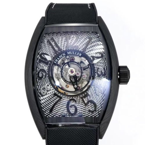 토노형(Cintree Curvex) 케이스는 카본 파이버로 제작되어 가볍고 강성이 뛰어나며, 스켈레톤 다이얼과 대형 아라비아 숫자 인덱스가 강렬한 존재감을 드러낸다.
