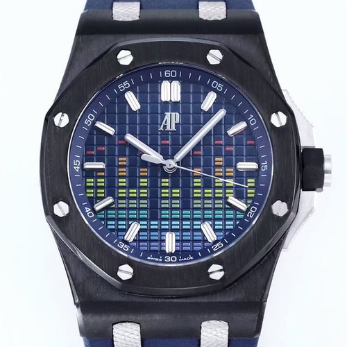 오데마 피게 로얄 오크 오프쇼어 뮤직 에디션 Ref.15600은 음악적 영감과 하이엔드 스포츠 워치 디자인을 결합한 독창적인 모델입니다. 직경 44mm, 두께 약 14mm의 견고한 스테인리스 스틸 케이스는 로얄 오크 오프쇼어 특유의 강인한 존재감을 보여주며, 다이얼에는 사운드 이퀄라이저를 연상시키는 ‘뮤직 텍스처’ 패턴이 적용되어 입체적이고 역동적인 인상을 제공합니다.