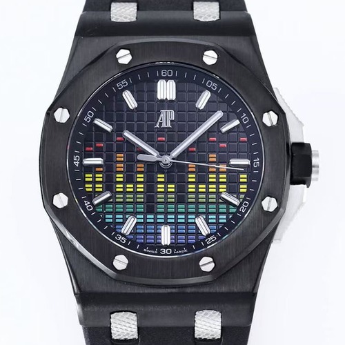 오데마 피게 로얄 오크 오프쇼어 뮤직 에디션 Ref.15600은 음악적 영감과 하이엔드 스포츠 워치 디자인을 결합한 독창적인 모델입니다. 직경 44mm, 두께 약 14mm의 견고한 스테인리스 스틸 케이스는 로얄 오크 오프쇼어 특유의 강인한 존재감을 보여주며, 다이얼에는 사운드 이퀄라이저를 연상시키는 ‘뮤직 텍스처’ 패턴이 적용되어 입체적이고 역동적인 인상을 제공합니다.