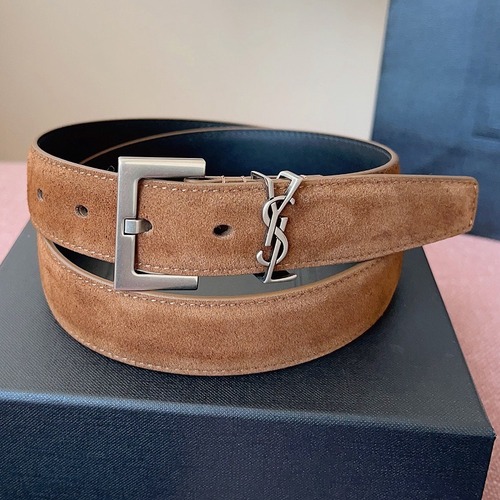생로랑의 시그니처 모노그램 디자인에 고급스러운 브라운 스웨이드 가죽을 적용한 벨트입니다. 프랑스 원산 소가죽을 기반으로 한 스웨이드(누벅 계열) 표면 가공으로 부드럽고 매트한 질감을 구현했으며, 빛 반사가 적어 차분하면서도 깊이 있는 분위기를 연출합니다. 3.0cm의 클래식한 스트랩 폭으로 남녀 모두 안정적인 착용이 가능하며, 실버 톤 YSL 모노그램 버클은 전체 황동 소재로 제작되어 스웨이드 특유의 질감과 강렬한 대비를 이룹니다. 정장, 블랙 셋업, 미니멀 캐주얼에 포인트로 활용하기 좋은 생로랑의 감각적인 벨트입니다.