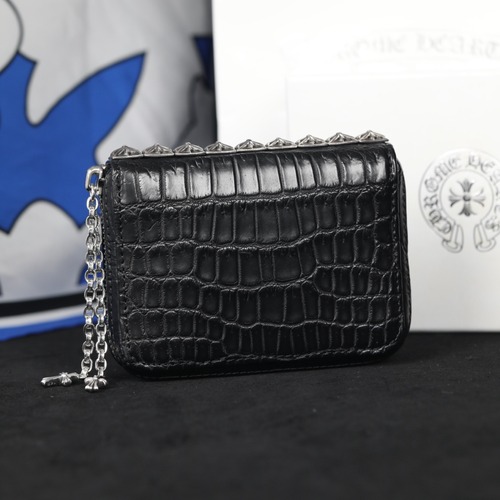 본 제품은 크롬하츠의 하이엔드 라인업에 속하는 스몰 레더 지갑으로, 외부 전체를 천연 악어가죽(크로커다일 레더)으로 제작한 나인 스터드 집 코인 월렛입니다. 입체적인 스케일 패턴의 악어가죽이 강렬한 존재감을 전달하며, 하단을 따라 배열된 나인 스터드와 체인, 지퍼 하드웨어는 모두 순은 925(Sterling Silver) 소재로 구성되어 묵직한 무게감과 깊은 에이징을 제공합니다. 내부는 크롬하츠 시그니처 패턴 패브릭 안감으로 마감되었으며, 수공 제작 공정을 통해 높은 완성도를 자랑합니다. 희소성과 소재 가치가 뛰어나 소장용으로도 손색없는 명품 지갑입니다.