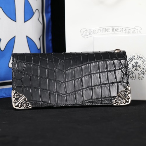 본 제품은 Chrome Hearts의 하이엔드 라인업에 속하는 크로커다일 가죽 롱 월렛으로, 소재와 하드웨어 모두에서 최상급 사양을 갖춘 모델입니다. 외부에는 결이 선명한 천연 크로커다일 가죽을 사용해 깊이 있는 광택과 입체적인 비늘 질감을 구현하였으며, 모서리에는 크롬하츠 시그니처 조형의 실버 925 순은 코너 플레이트가 수공으로 세팅되어 강렬한 존재감을 완성합니다. 내부는 실용적인 카드 슬롯과 지폐 수납 구조로 구성되어 있으며, 장기간 사용 시 가죽과 실버 모두 자연스러운 에이징을 즐길 수 있습니다. 희소성과 소장 가치를 중시하는 사용자에게 적합한 크롬하츠 정통 장지갑입니다.