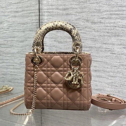 레이디 디올 미니 백은 디올을 대표하는 아이코닉한 퀼팅 실루엣에 고급 램스킨을 사용해 우아하고 클래식한 분위기를 완성한 모델입니다. 핸들 부분에는 천연 파이톤 가죽을 적용해 한 점 한 점 다른 결 무늬를 지니며, 동일한 패턴이 존재하지 않는 희소성과 개성을 제공합니다. 전면에는 디올 시그니처 금속 참 장식이 더해져 브랜드 아이덴티티를 강조하며, 컴팩트한 17cm 사이즈로 포멀룩부터 데일리 룩까지 폭넓게 활용 가능합니다.