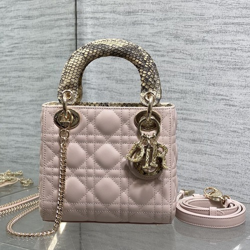 레이디 디올 미니 백은 디올을 대표하는 아이코닉한 퀼팅 실루엣에 고급 램스킨을 사용해 우아하고 클래식한 분위기를 완성한 모델입니다. 핸들 부분에는 천연 파이톤 가죽을 적용해 한 점 한 점 다른 결 무늬를 지니며, 동일한 패턴이 존재하지 않는 희소성과 개성을 제공합니다. 전면에는 디올 시그니처 금속 참 장식이 더해져 브랜드 아이덴티티를 강조하며, 컴팩트한 17cm 사이즈로 포멀룩부터 데일리 룩까지 폭넓게 활용 가능합니다.