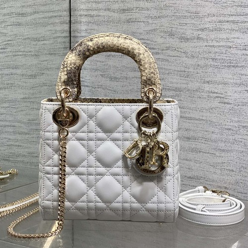 레이디 디올 미니 백은 디올을 대표하는 아이코닉한 퀼팅 실루엣에 고급 램스킨을 사용해 우아하고 클래식한 분위기를 완성한 모델입니다. 핸들 부분에는 천연 파이톤 가죽을 적용해 한 점 한 점 다른 결 무늬를 지니며, 동일한 패턴이 존재하지 않는 희소성과 개성을 제공합니다. 전면에는 디올 시그니처 금속 참 장식이 더해져 브랜드 아이덴티티를 강조하며, 컴팩트한 17cm 사이즈로 포멀룩부터 데일리 룩까지 폭넓게 활용 가능합니다.