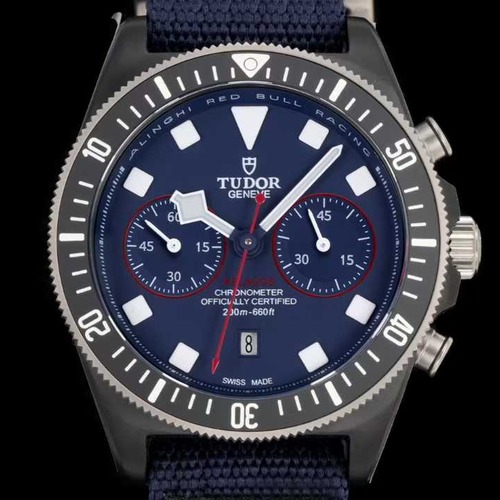 튜더 펠라고스 FXD 크로노그래프 알링기 레드불 레이싱 에디션 콘셉트의 핑크 다이얼 모델입니다. 43mm 케이스는 블랙 카본(컴포지트) 계열 소재로 가볍고 스포티한 착용감을 지향하며, 60분 스케일의 티타늄 양방향 회전 베젤(120클릭)이 적용된 구성이 특징입니다. 판매자 표기 기준으로 7750 자동 크로노그래프 무브먼트, 날짜, 중앙 크로노 초침, 45분 카운터 기능을 지원하며, 원피스 직조 스트랩과 빠른 탈착용 스트랩 구성(프로모션 표기)을 제공합니다.