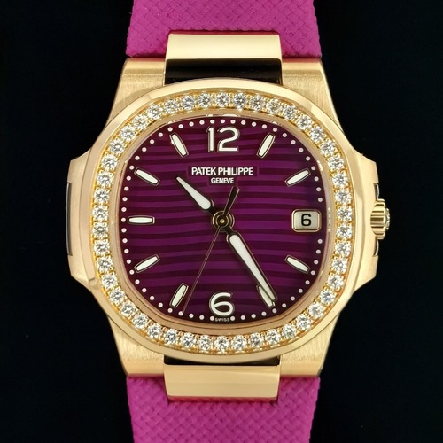 본 상품은 파텍필립 노틸러스 여성 라인을 기반으로 제작된 36mm 사이즈의 럭셔리 스포츠 시계입니다. 여성 손목에 가장 이상적인 비율로 설계된 케이스 사이즈와 슬림한 두께를 통해 우아함과 스포티함을 동시에 만족시켜 드립니다. 퍼플 컬러의 수평 패턴 다이얼은 노틸러스 특유의 아이덴티티를 유지하면서도 여성스러운 감성을 극대화하며, 다이얼 위 입체적인 아플리케 인덱스는 뛰어난 시인성을 제공합니다.