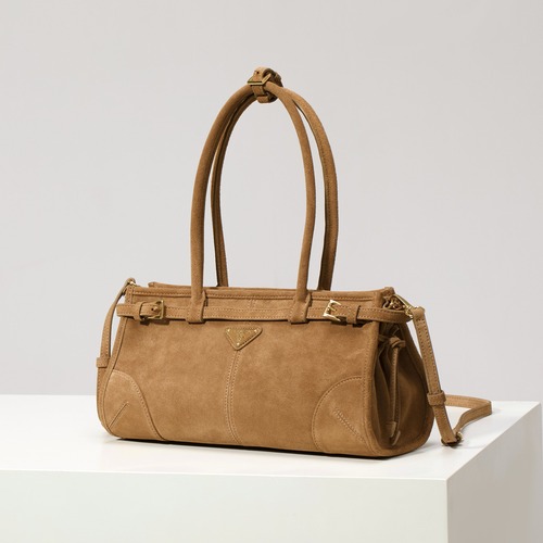 프라다 Soft Lux 라인은 부드러운 소재감과 실용적인 구조를 중심으로 전개되는 프라다의 데일리 럭셔리 라인으로, 과하지 않은 디자인 속에 고급스러운 분위기를 담아낸 것이 특징입니다. 본 제품은 촉감이 매우 부드러운 스웨이드 가죽(샌딩 처리된 소가죽)을 사용하여 빈티지하면서도 따뜻한 감성을 자연스럽게 표현하며, 브라운 컬러 특유의 깊이 있는 톤이 전체적인 완성도를 높여줍니다.