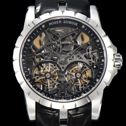 로저드뷔 엑스칼리버 더블 투르비용은 하이엔드 오뜨 오를로제리의 정점을 보여주는 상징적인 모델로, 극한의 기술력과 예술적 미학이 결합된 대표적인 컴플리케이션 시계입니다. 좌우 대칭으로 배치된 두 개의 투르비용 케이지는 중력 오차를 최소화하며, 동시에 강렬한 비주얼 임팩트를 제공합니다. 오픈워크 스켈레톤 다이얼을 통해 무브먼트의 작동 구조를 그대로 감상할 수 있으며, 정교하게 마감된 브릿지와 기어 트레인은 로저드뷔 특유의 공격적인 디자인 언어를 그대로 담아냅니다. 45mm 로즈골드 케이스는 존재감이 매우 뛰어나며, 남성 손목 위에서 확실한 중심감을 형성합니다. 수동 와인딩 방식의 더블 투르비용 무브먼트는 극도로 높은 조립 난이도를 요구하며, 정확도와 안정성을 위해 장시간 테스트 과정을 거친 것이 특징입니다. 이 모델은 단순한 시계를 넘어, 기술적 성취와 소장 가치를 동시에 만족시키는 하이엔드 컬렉터 워치입니다.