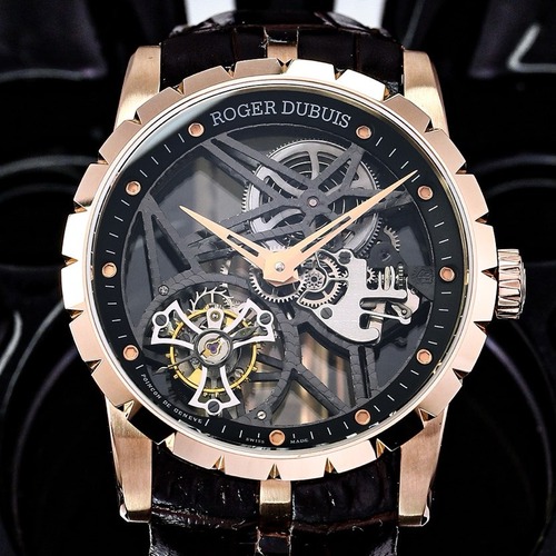 로저드뷔 엑스칼리버 스켈레톤 플라잉 투르비옹 42mm는 제네바 하이엔드 워치메이킹의 정수를 담은 대표적인 투르비옹 타임피스입니다. 42mm 케이스는 로즈 골드 톤의 고급스러운 마감으로 완성되었으며, 대담한 스켈레톤 구조를 통해 무브먼트의 정교한 작동을 전면에서 감상할 수 있습니다. 다이얼 중앙에는 플라잉 투르비옹이 배치되어 중력을 상쇄하는 고난도 기술을 시각적으로 표현하며, 로저드뷔 특유의 강렬한 디자인 아이덴티티를 확립합니다. 내부에는 인하우스 수동 무브먼트 RD505SQ가 탑재되어 약 60시간의 파워리저브를 제공하며, 제네바 씰(Poinçon de Genève) 인증을 받아 마감과 성능 모두 최고 수준임을 증명합니다. 사파이어 크리스탈 글래스와 시스루 케이스백을 통해 전면과 후면 모두에서 무브먼트의 입체적인 구조를 감상할 수 있으며, 하이엔드 컬렉터와 투르비옹 애호가를 위한 상징적인 모델로 평가받습니다.