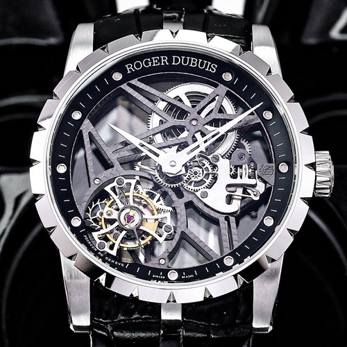 로저드뷔 엑스칼리버 스켈레톤 플라잉 투르비옹 42mm는 제네바 하이엔드 워치메이킹의 정수를 담은 대표적인 투르비옹 타임피스입니다. 42mm 케이스는 로즈 골드 톤의 고급스러운 마감으로 완성되었으며, 대담한 스켈레톤 구조를 통해 무브먼트의 정교한 작동을 전면에서 감상할 수 있습니다. 다이얼 중앙에는 플라잉 투르비옹이 배치되어 중력을 상쇄하는 고난도 기술을 시각적으로 표현하며, 로저드뷔 특유의 강렬한 디자인 아이덴티티를 확립합니다. 내부에는 인하우스 수동 무브먼트 RD505SQ가 탑재되어 약 60시간의 파워리저브를 제공하며, 제네바 씰(Poinçon de Genève) 인증을 받아 마감과 성능 모두 최고 수준임을 증명합니다. 사파이어 크리스탈 글래스와 시스루 케이스백을 통해 전면과 후면 모두에서 무브먼트의 입체적인 구조를 감상할 수 있으며, 하이엔드 컬렉터와 투르비옹 애호가를 위한 상징적인 모델로 평가받습니다.