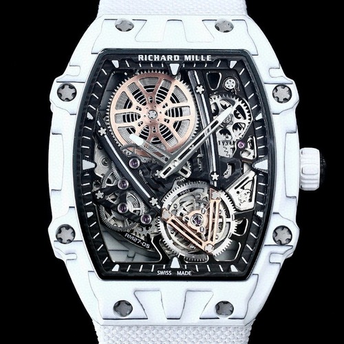 | 무브먼트 상세 | RM 27-05에 탑재된 무브먼트는 초경량화를 최우선 목표로 설계된 수동 와인딩 스켈레톤 플라잉 투르비옹 칼리버이다. 메인 플레이트와 브릿지는 경량 합금 및 티타늄 기반 구조로 제작되어 무게를 최소화하면서도 구조적 강성을 유지한다. 플라잉 투르비옹 구조를 통해 상부 브릿지를 제거하여 충격 분산 성능과 시각적 개방감을 동시에 확보했으며, 기어 트레인은 V자형 브릿지 레이아웃으로 고정되어 스포츠 환경에서도 안정적인 동작을 유지한다. 약 55~60시간의 파워리저브를 제공하며, 극한의 가속 충격 상황에서도 정확성을 유지하도록 테스트된 것이 가장 큰 특징이다. |