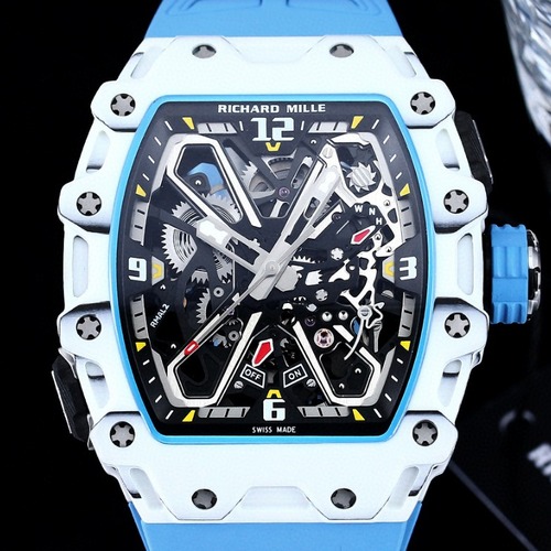리차드 밀 RM 35-03 오토매틱 라파엘 나달은 극한의 스포츠 환경과 일상 착용을 동시에 고려해 설계된 하이엔드 스켈레톤 오토매틱 시계다. 전체 무게는 약 88.8g으로 투르비옹이 아닌 자동 무브먼트 모델 중에서도 매우 가벼운 편에 속하며, 케이스 두께는 약 13.5mm로 스포티한 존재감을 유지한다. 케이스는 석영 섬유 NTPT와 카본 TPT 복합 소재를 사용해 뛰어난 내충격성과 경량성을 확보했으며, 컬러에 따라 블랙 TPT, 블루 NTPT, 화이트 NTPT 등 다양한 소재 조합이 적용된다. 다이얼은 완전 스켈레톤 구조로 설계되어 전면에서 기어 트레인, 브릿지, 자동 와인딩 시스템의 작동을 직접 감상할 수 있다. 러버 스트랩과 인체공학적 케이스 디자인은 손목 밀착력을 높여 장시간 착용에도 안정적인 착용감을 제공하며, 스포츠 워치이면서도 리차드 밀 특유의 기계미와 고급감을 동시에 만족시키는 모델이다.