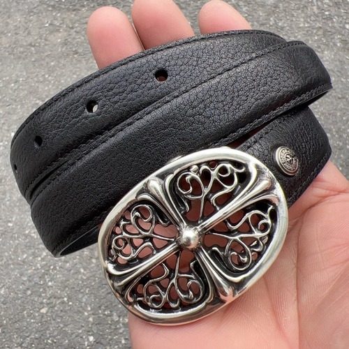 크롬하츠의 상징적인 “Keeper(키퍼)” 크로스 조각 버클을 적용한 클래식 벨트입니다. 폭 2.5cm로 데님, 치노, 슬랙스까지 폭넓게 매치가 가능하며 남녀공용으로 활용하기 좋은 균형 잡힌 비율이 장점입니다. 스트랩은 원판 사양의 오일 왁스 가공 소가죽을 사용해 촉감이 탄탄하고 표면 결이 자연스럽게 살아 있으며, 착용을 반복할수록 깊이 있는 에이징이 형성됩니다. 버클은 황동 베이스에 925 실버가 세팅(인레이/장식)된 구조로 표기되어, 실버 특유의 입체 음영과 묵직한 존재감을 강조합니다. 홀 방식으로 사이즈 조절이 가능하고, 버클 조각 디테일이 중심 포인트가 되어 상의가 심플해도 스타일이 완성되는 타입입니다.