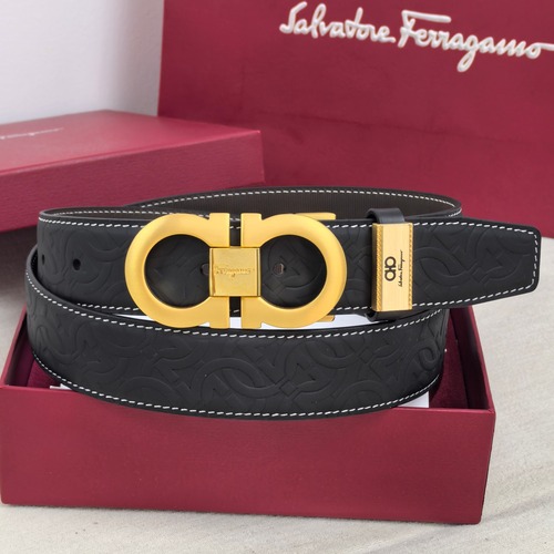 고객님께서 지금보시고 계시는 상품은 살바토레 페라가모의 시그니처 더블 간치니 버클이 적용된 3.5cm 폭 리버서블 남성 벨트입니다. 스트랩 전면에는 입체감 있는 엠보 텍스처가 정교하게 표현되어 고급스러운 표면감이 살아 있고, 반대면은 단색 톤으로 구성되어 정장부터 캐주얼까지 상황에 맞게 깔끔하게 연출하실 수 있습니다. 더블 간치니 버클은 브랜드 아이덴티티를 선명하게 보여주면서도 과하지 않은 균형감으로 코디의 중심을 잡아주며, 차분한 다크 메탈 톤 하드웨어가 블랙 스트랩과 어우러져 세련된 인상을 완성해 드립니다. 3.5cm의 클래식 폭은 허리 라인을 안정적으로 잡아주어 슬랙스, 데님, 치노 등 다양한 팬츠와 매치했을 때 실루엣이 정돈되어 보이는 장점이 있습니다. 한 개의 벨트로 두 가지 무드를 활용할 수 있어 데일리 벨트로 활용도가 높은 클래식 아이템입니다.