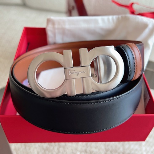 고객님께서 지금보시고 계시는 상품은 살바토레 페라가모의 시그니처 더블 간치니 버클이 적용된 3.5cm 폭 리버서블 남성 벨트입니다. 스트랩 전면에는 입체감 있는 엠보 텍스처가 정교하게 표현되어 고급스러운 표면감이 살아 있고, 반대면은 단색 톤으로 구성되어 정장부터 캐주얼까지 상황에 맞게 깔끔하게 연출하실 수 있습니다. 더블 간치니 버클은 브랜드 아이덴티티를 선명하게 보여주면서도 과하지 않은 균형감으로 코디의 중심을 잡아주며, 차분한 다크 메탈 톤 하드웨어가 블랙 스트랩과 어우러져 세련된 인상을 완성해 드립니다. 3.5cm의 클래식 폭은 허리 라인을 안정적으로 잡아주어 슬랙스, 데님, 치노 등 다양한 팬츠와 매치했을 때 실루엣이 정돈되어 보이는 장점이 있습니다. 한 개의 벨트로 두 가지 무드를 활용할 수 있어 데일리 벨트로 활용도가 높은 클래식 아이템입니다.