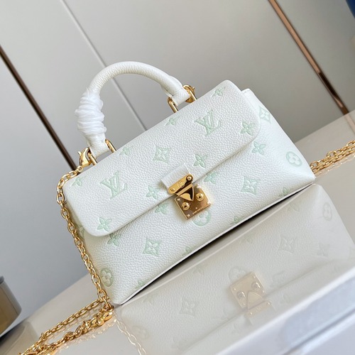 고객님께서 지금보시고 계시는 상품은 루이비통 나노 마들렌(Nano Madeleine) M12144로, 마들렌 라인의 감성을 한층 더 컴팩트하게 담아낸 미니 사이즈 핸드백입니다. 입체감 있는 모노그램 앙프렝뜨 엠보싱 가죽 바디에 크림 톤과 그린 포인트가 어우러져 산뜻하면서도 고급스러운 분위기를 완성해 드립니다. 전면에는 트렁크 무드의 S-락 잠금장치가 적용되어 작은 사이즈에서도 아이코닉한 존재감을 살렸고, 체인에는 LV 서클 장식이 더해져 디테일 완성도를 높였습니다. 21cm 길이의 미니 비율로 휴대폰, 카드지갑, 키, 립 제품 등 데일리 필수 소지품을 깔끔하게 담기 좋으며, 탑핸들로 손에 들거나 체인 스트랩을 활용해 숄더 및 크로스 연출까지 폭넓게 활용하실 수 있습니다. 클래식한 구조감과 세련된 컬러 포인트가 동시에 살아 있어 데일리룩부터 모임, 하객룩까지 자연스럽게 매치하기 좋습니다.
