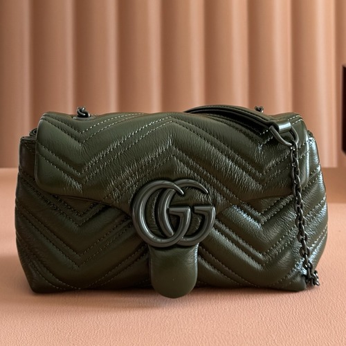 고객님께서 지금보시고 계시는 상품은 Gucci GG Marmont 라인의 시그니처인 V 쉐브론 마틀라세 퀼팅을 미니 사이즈로 구현한 숄더백입니다. 부드러운 가죽 바디에 더블 G 로고를 전면 포인트로 배치해 브랜드 아이덴티티를 선명하게 보여드리며, 톤온톤으로 정리된 에나멜 하드웨어가 전체 무드를 고급스럽게 완성해드립니다. 여닫이는 마그넷 방식으로 간편하게 오픈·클로징이 가능하고, 체인과 가죽이 결합된 스트랩으로 어깨에 걸었을 때 안정적인 착용감을 기대하실 수 있습니다. 내부는 패브릭 라이닝으로 깔끔하게 마감되어 소지품 보호에 유리하며, 컴팩트한 사이즈이지만 데일리 필수 아이템을 담기 좋은 실용성을 갖추고 있습니다. 그린 컬러가 스타일링에 자연스럽게 포인트가 되어 계절감 있는 데일리 룩부터 톤온톤 코디까지 폭넓게 활용하시기 좋습니다.