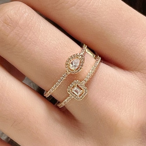 마이 트윈(My Twin) 특유의 세련된 라인감에 ‘더블 로우’ 구조를 더해, 손끝에서 입체적으로 빛이 살아나는 오픈 타입 링입니다. 링 상단에는 두 줄로 이어지는 파베 세팅이 촘촘하게 배치되어, 조명과 각도에 따라 반짝임이 넓게 퍼지며 존재감을 확실하게 만들어드립니다. 중앙 포인트는 물방울(페어) 실루엣과 각진 스텝 컷 감성의 스톤 구성이 조화를 이루어, 단정하면서도 감각적인 대비가 느껴지는 것이 특징입니다. 오픈 밴드 구조라 착용 실루엣이 답답하지 않고, 단독 착용은 물론 다른 링과 레이어드했을 때에도 중심 장식이 또렷하게 살아나 스타일링 활용도가 높습니다. 컬러는 실버 톤과 로즈 골드 톤 두 가지 무드로 구성되어, 모던한 분위기부터 부드러운 포인트 연출까지 취향에 맞춰 선택하시기 좋습니다.