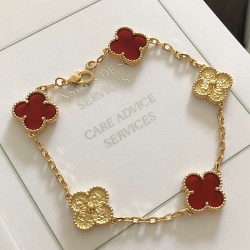 고객님께서 지금보시고 계시는 상품은 Van Cleef & Arpels Vintage Alhambra Bracelet입니다. 반클리프 아펠을 대표하는 알함브라 클로버 모티프를 중심으로, 선명한 레드 톤의 카닐리언(홍옥수) 천연석이 주는 깊은 색감과 18K 옐로우 골드의 따뜻한 광택이 조화를 이루는 팔찌입니다. 모티프 가장자리는 알함브라 특유의 비즈드(구슬) 엣지로 마감되어 입체감이 살아나며, 체인 연결부까지 깔끔하게 이어져 손목 위에서 한층 정돈된 실루엣을 완성합니다. 레드 컬러가 포인트가 되어 단독 착용만으로도 분위기가 살아나고, 시계나 골드 주얼리와 레이어드하면 더욱 고급스럽게 연출됩니다. 격식 있는 자리부터 데일리 룩까지 폭넓게 어울리며, 선물용으로도 만족도가 높은 클래식 아이콘 주얼리입니다.