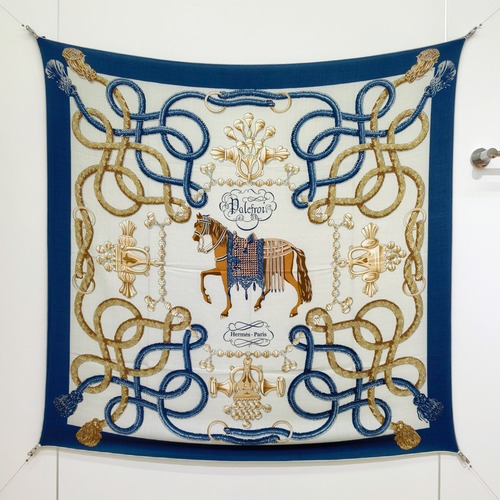 고객님께서 지금보시고 계시는 상품은 에르메스 캐시미어 실크 숄 140 “준마” 모델입니다. 140×140cm의 넉넉한 정사각 사이즈로, 숄처럼 어깨에 걸치거나 스카프로 목을 감싸는 등 활용도가 매우 뛰어난 아이템입니다. 화이트 베이스에 블루 보더와 마구(마구류)에서 영감을 받은 그래픽 라인이 어우러져, 에르메스 특유의 승마 헤리티지를 세련되게 표현합니다. 소재는 캐시미어 70%와 실크 30% 혼방으로, 캐시미어의 포근함과 실크의 은은한 광택·찰랑한 드레이프가 균형 있게 느껴지는 것이 장점입니다. 가볍게 접어 휴대하기 좋고, 코트·니트·가죽 재킷 등 다양한 아우터 위에 포인트로 매치하면 룩의 완성도를 한 단계 끌어올려 줍니다. 단독 착용은 물론, 가방 손잡이에 리본처럼 묶거나 헤어 액세서리로 연출해도 고급스러운 분위기를 유지할 수 있습니다.