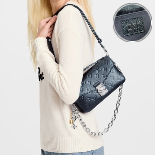 고객님께서 지금보시고 계시는 상품은 루이비통 포쉐트 메티스 이스트 웨스트 핸드백으로, 슬림한 가로형 비율과 구조적인 플랩 라인이 매력적인 미니 숄더백입니다. 진주광이 감도는 블루 컬러와 입체적인 엠보싱 텍스처가 조합되어, 과하지 않게 포인트를 주면서도 고급스러운 분위기를 완성합니다. 플랩 중앙의 락 잠금 디테일로 클래식한 무드를 살리고, 내부는 분리 수납에 유리한 구성으로 소지품을 깔끔하게 정리하기 좋습니다. 스트랩으로 숄더 및 크로스 착용이 가능해 이동이 많은 일정에서도 활용도가 높으며, 체인 디테일이 더해져 캐주얼부터 단정한 룩까지 폭넓게 어울립니다. 데일리 미니백을 찾는 분께 활용 만족도가 높은 선택지입니다.