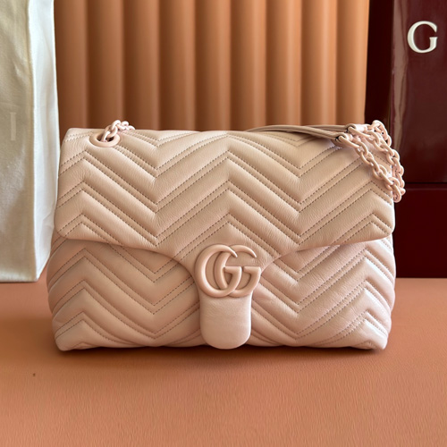 고객님께서 지금보시고 계시는 상품은 구찌 GG Marmont 라인의 퀼팅 나파 체인 숄더백으로, 더블 G 로고와 입체적인 쉐브론 퀼팅이 정돈된 실루엣을 만들어주는 디자인입니다. 부드러운 나파 가죽 표면과 촘촘한 스티치가 어우러져 촉감과 완성도가 뛰어나며, 가로 31cm 비율로 휴대폰·지갑·파우치 등 데일리 소지품을 균형 있게 담기 좋습니다. 슬라이딩 체인 숄더 스트랩 구조로 착용 높이를 조절할 수 있어 코디와 상황에 맞춰 활용이 편하고, 플랩 형태의 자석 여밈으로 오픈·클로즈 동선이 깔끔합니다. 내부에는 지퍼 포켓이 있어 소형 소지품을 분리 수납하기 좋고, 후면 오픈 포켓을 함께 사용하면 자주 꺼내는 아이템을 빠르게 정리할 수 있습니다. 은은한 핑크 컬러가 과하지 않은 포인트가 되어 캐주얼부터 세미 포멀 룩까지 폭넓게 매치하시기 좋습니다.