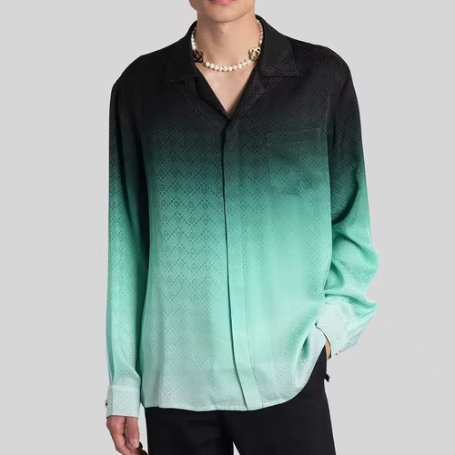 고객님께서 지금보시고 계시는 상품은 카사블랑카 2025 S/S 시즌 감성을 담은 그라데이션 모노그램 자카드 롱슬리브 셔츠입니다. 블랙에서 민트 톤으로 자연스럽게 이어지는 컬러 그라데이션이 고급스럽고 세련된 분위기를 연출하며, 전체 원단에 자카드 방식으로 모노그램 패턴이 정교하게 표현되어 단독 착용만으로도 완성도 높은 스타일링이 가능합니다. 오픈카라 디자인으로 여유로운 실루엣을 보여주며, 전면 버튼 여밈 구조로 단정함과 캐주얼한 무드를 동시에 만족시켜드립니다. 폴리에스터 100% 자카드 원단을 사용해 가볍고 관리가 비교적 수월하며, 간절기부터 여름까지 다양하게 활용하시기 좋습니다. 원단의 결을 오래 유지하기 위해 드라이클리닝 또는 약한 코스 세탁을 권장드립니다.