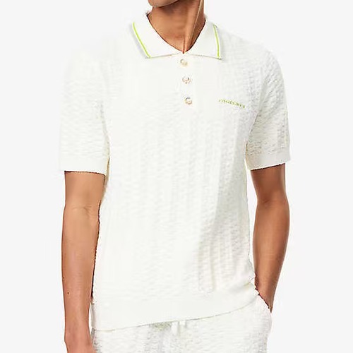 고객님께서 지금보시고 계시는 상품은 카사블랑카 2026 S/S 시즌 케이블 니트 코튼 폴로 셔츠입니다. 클래식한 케이블 조직을 전면에 적용하여 입체적인 텍스처와 고급스러운 분위기를 동시에 연출하며, 깨끗한 화이트 컬러 바탕에 카라 부분 배색 라인 디테일을 더해 세련된 포인트를 완성했습니다. 3버튼 여밈 구조와 단정한 폴로 칼라 디자인으로 포멀함과 캐주얼함을 균형 있게 표현하며, 코튼 100% 니트 원단으로 부드럽고 쾌적한 착용감을 제공합니다. 여름 시즌 단독 착용은 물론 슬랙스나 쇼츠와 매치하여 다양한 스타일링이 가능하며, 니트 조직 특성상 형태 유지를 위해 드라이클리닝 또는 손세탁을 권장드립니다.