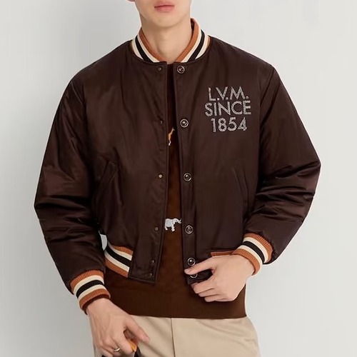고객님께서 지금보시고 계시는 상품은 루이비통 하우스의 헤리티지를 상징하는 L.V.M Since 1854 레거시 라인을 기반으로 제작된 바시티 자켓입니다. 브랜드 창립 연도인 1854 그래픽 자수를 전면과 후면에 입체적으로 배치하여 클래식하면서도 강한 존재감을 전달하며, 루이비통 특유의 아카이브 감성을 현대적인 스트리트 무드로 재해석한 디자인이 특징입니다. 은은한 광택감이 느껴지는 새틴 질감의 폴리에스터 원단을 사용하여 고급스러운 표면감을 완성하였으며, 가볍지만 탄탄한 구조로 계절 간 활용도가 뛰어난 아우터입니다. 넥라인과 소매, 밑단에는 스트라이프 리브 니트 마감을 적용하여 안정적인 착용감과 동시에 스포츠 무드를 강조하였고, 전면 스냅 버튼 구조로 간편한 탈착이 가능합니다. 여유 있는 실루엣으로 다양한 이너와 레이어드가 가능하며 캐주얼부터 세미 스트리트 스타일까지 폭넓게 연출할 수 있는 아이템입니다.