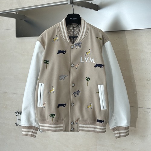 고객님께서 지금보시고 계시는 상품은 루이비통 2026 S/S 컬렉션의 애니멀 자수 바시티 재킷입니다. 베이지 톤 울 혼방 바디 위로 기린·코끼리·흑표 등 다양한 동물 모티프 자수가 촘촘하게 배치되어, 한눈에 포인트가 살아나는 디자인이 특징입니다. 가슴에는 “L.V.M.” 레터링 자수가 더해져 바시티 특유의 스포티한 무드에 그래픽 감성을 강조했으며, 아이보리 톤의 가죽 슬리브가 대비감을 만들어 전체 실루엣을 더욱 또렷하게 완성합니다. 넥·소매·밑단은 스트라이프 리브 시보리로 마감되어 안정적인 착용감을 제공하고, 단정한 라운딩 라인과 버튼 클로징으로 데일리 코디에 쉽게 매치됩니다. 데님, 치노, 조거 팬츠 등 다양한 하의와 조합해도 완성도가 높아, 단품만으로도 스타일의 중심이 되는 아우터입니다.