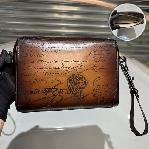 고객님께서 지금보시고 계시는 상품은 벨루티 특유의 파티나 가죽 컬러와 클래식한 스크립트 패턴이 조화를 이루는 가죽 클러치백으로, 세련된 디자인과 실용성을 동시에 갖춘 고급 핸드 클러치입니다. 이탈리아산 송아지 가죽을 사용하여 부드럽고 밀도 높은 가죽 질감을 제공하며, 장인의 수작업 착색 공정을 통해 깊이 있는 브라운 파티나 컬러와 자연스러운 그라데이션이 표현됩니다. 가방 전면에는 벨루티 시그니처 스크립트 패턴이 가죽 위에 표현되어 브랜드 고유의 클래식한 감성을 강조하며, 슬림하면서도 안정적인 구조로 제작되어 형태가 깔끔하게 유지됩니다. 상단 지퍼 클로저 구조로 내부 소지품을 안전하게 보관할 수 있으며, 내부 공간은 휴대폰, 카드지갑, 열쇠, 작은 전자기기 등 다양한 소지품을 정리하기에 적합하게 설계되었습니다. 측면 손목 스트랩이 연결되어 있어 휴대가 편리하며, 비즈니스와 캐주얼 스타일 모두에 자연스럽게 어울리는 고급 가죽 클러치백입니다.