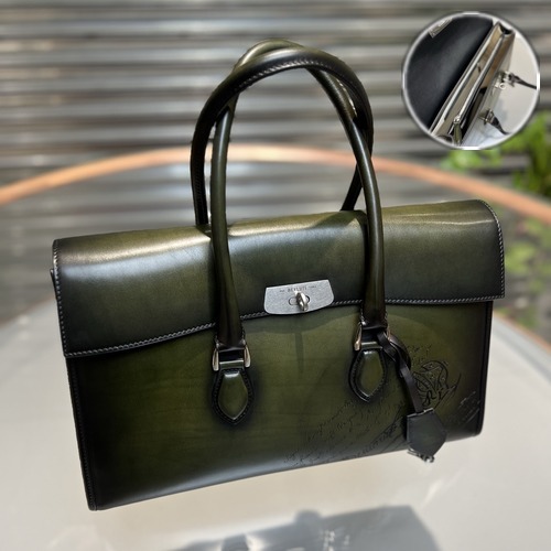 고객님께서 지금보시고 계시는 상품은 벨루티 특유의 파티나 가죽 컬러와 클래식한 브리프케이스 실루엣이 조화를 이루는 락 브리프케이스로, 비즈니스 스타일을 완성하는 고급 가죽 서류가방입니다. 이탈리아산 송아지 가죽을 사용하여 표면이 부드럽고 밀도가 높으며, 장인의 수작업 착색 공정을 통해 깊이 있는 올리브 브라운 컬러와 자연스러운 그라데이션이 표현됩니다. 가방 전면은 구조적인 패턴으로 제작되어 안정적인 형태를 유지하며, 상단 더블 핸들 구조로 손에 들었을 때 균형감이 좋고 편안한 그립감을 제공합니다. 전면에는 스트랩과 락 디테일이 적용되어 클래식한 비즈니스 디자인을 강조하며, 측면 금속 링을 통해 스트랩 연결이 가능해 숄더 스타일로도 활용할 수 있습니다. 내부 공간은 넉넉하게 설계되어 노트북, 태블릿, 문서, 지갑 등 다양한 비즈니스 필수품을 효율적으로 수납할 수 있으며, 정장이나 코트 스타일과 자연스럽게 어울리는 고급 가죽 브리프케이스입니다.