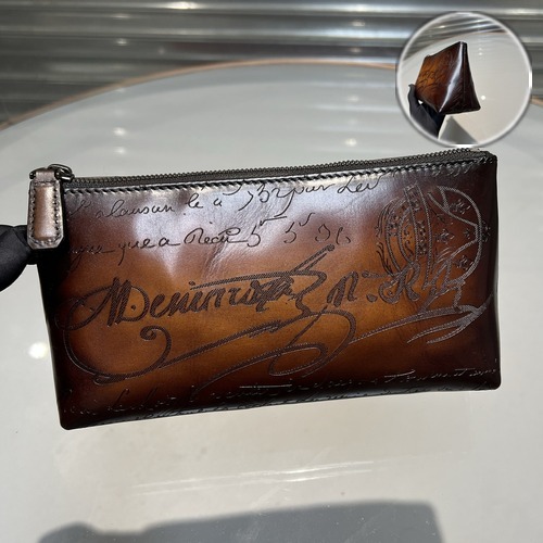 고객님께서 지금보시고 계시는 상품은 벨루티 특유의 파티나 가죽 컬러와 클래식한 스크립트 패턴이 어우러진 가죽 클러치 파우치로, 미니멀한 디자인과 실용적인 수납 구조를 갖춘 고급 클러치백입니다. 이탈리아산 A급 송아지 가죽을 사용하여 부드럽고 탄력 있는 가죽 질감을 제공하며, 장인의 전통 수작업 착색 공정을 통해 깊이 있는 브라운 파티나 컬러와 자연스러운 그라데이션이 완성됩니다. 전면에는 벨루티 시그니처 스크립트 패턴이 가죽 위에 표현되어 브랜드 특유의 클래식한 분위기를 강조하며, 슬림하면서도 안정적인 바디 구조로 제작되어 형태가 단정하게 유지됩니다. 상단 지퍼 구조로 개폐가 간편하며 내부 공간은 휴대폰, 카드지갑, 열쇠, 작은 소지품 등을 정리하기에 적합하게 설계되었습니다. 컴팩트한 사이즈 덕분에 손에 들고 사용하기 편리하며, 캐주얼 스타일과 포멀 스타일 모두에 자연스럽게 어울리는 실용적인 가죽 클러치 파우치입니다.