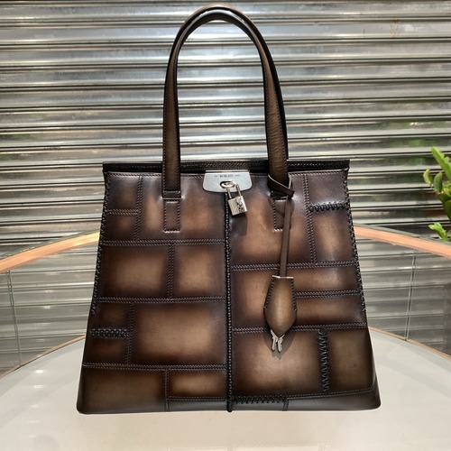 고객님께서 지금보시고 계시는 상품은 손바느질 패치워크 디테일로 완성도를 높인 벨루티 가죽 토트백으로, 클래식한 토트 실루엣에 입체적인 패널 구성이 더해져 스타일과 존재감이 확실한 제품입니다. 이탈리아산 송아지 가죽을 사용해 바디가 탄탄하게 형태를 잡아주며, 고전 수작업 착색 공정을 통해 브라운 톤의 깊이 있는 농담과 자연스러운 가죽 표정이 살아 있습니다. 전면과 측면에 규칙적으로 배열된 패치워크 패널이 가방 전체의 분위기를 단정하게 정리해주고, 상단 더블 핸들은 손에 들었을 때 균형감이 좋아 데일리 이동에서 안정적인 사용감을 제공합니다. 넉넉한 바닥 폭과 높이로 지갑, 파우치, 태블릿, 소형 소지품을 여유 있게 담을 수 있으며, 구조적인 바디 덕분에 수납 후에도 실루엣이 깔끔하게 유지됩니다. 캐주얼부터 포멀까지 폭넓게 어울리는 디자인으로, 출근·외출·여행 이동 시에도 활용도가 높은 고급 가죽 토트백입니다.